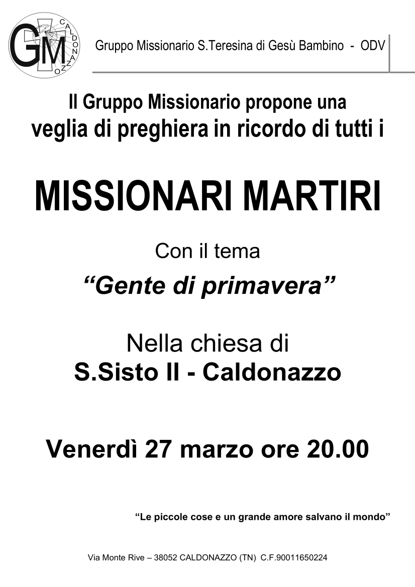 Caldonazzo 27 marzo ore 20.00: Veglia di Preghiera per i “Missionari Martiri” Pubblicato il 20 Marzo 2026